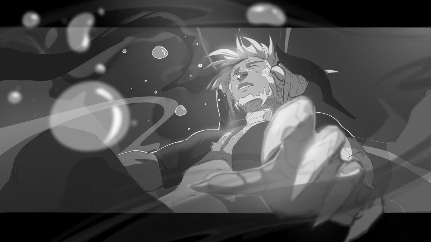 Ridel had gotten more and more isolated and lonely as time went on, and his father becoming sick did little to help this. He had no friends, eventually had his journals and adventure stories taken from him, and had his horns cut in hopes of being permanently removed. But to no avail, for they continued to grow back, as did his wandering spirit, his desire for adventure, for wanting to see the world above him. It was stifling.When he came of age, the events of the calamity had passed, and Ridel felt the fire within him burn again. He wanted to go to the surface, to help the people up above-to be a hero, like the ones he read about in all his adventure books, like the one his mother had named him after, who saved her when she was young and traveling the lands beyond the bubble. The Kojin trader that had been visiting him with books felt a deep sympathy for him, and decided to assist in his plan to leave.In the night, Ridel had done his ritual with the kojin, and finally made for his escape, but realized quickly that he never learned how to swim, and was immediately swept away by a nasty undertow in the stormy sea, a welt on his head given by the harsh rocks below.